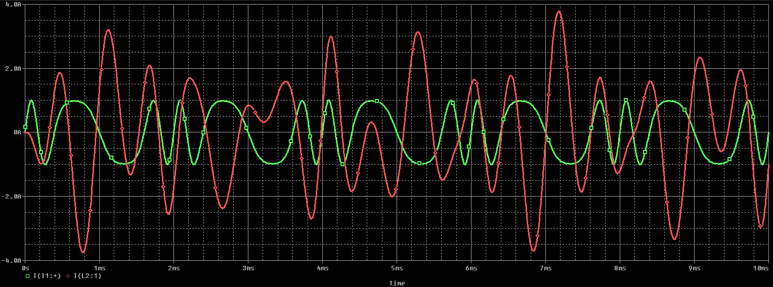 由于單個組件無法單獨(dú)檢查各個組件對輸入波形的影響,因此我們必須在較大的電路中查看這些組件。下圖顯示了一個簡單的電路,其中的FM源(1 A,1 kHz,調(diào)制指數(shù)為4)連接到Pi濾波器和電阻負(fù)載(R2)。這種類型的信號源具有很強(qiáng)的調(diào)制能力,在時域中很容易看出來,但是R2的時間行為并不總是很明顯。下面的Pi濾波器用作低通濾波器,但也可以通過互換電容器和電感器將其更改為高通濾波器。
