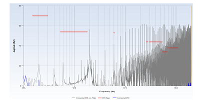 上面是開關電源輸入端的傳導EMI的仿真。紅線是CISPR25限制,如果要通過汽車用途認證,則需要遵守這些限制。該設計并非旨在用于汽車用途,但這是一個易于使用的示例?;疑靵y是沒有濾波器的傳導EMI。它顯然嚴重超出了限制。您可能只需要在左下角和右下角劃出的藍色走線就是帶有基本PI濾波器的傳導EMI。