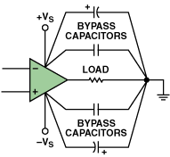 直接從運(yùn)放的電源插腳開(kāi)始;具有較低值和最小物理尺寸的電容器應(yīng)與運(yùn)放放放在電路板的同一側(cè),并盡可能靠近放大器。電容器的接地側(cè)應(yīng)以最小的引線或跡線長(zhǎng)度連接到接地平面。該接地連接應(yīng)盡可能靠近放大器的負(fù)載,以盡量減少引腳和接地之間的干擾。圖2說(shuō)明了這種技術(shù)。