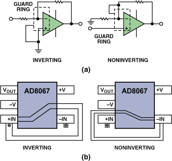 (圖15.護(hù)環(huán).(a)反轉(zhuǎn)和非反轉(zhuǎn)操作.(b) SOT-23-5封裝.