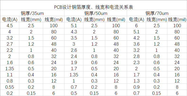 PCB設(shè)計中載流能力取決于線寬、線厚、容許升溫,下列的銅箔厚度、線寬、電流關(guān)系表是根據(jù)公式計算得來,可以直接使用,其中銅箔厚度分為35um50um、70umum單位:微米),大家在進(jìn)行PCB設(shè)計的時候可以直接參考,直接上干貨