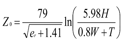 等式中的變量為:H =平面上方的高度,W =跡線寬度,T =跡線厚度,e?=相對(duì)介電常數(shù)或DkZ?=阻抗(以歐姆為單位)。